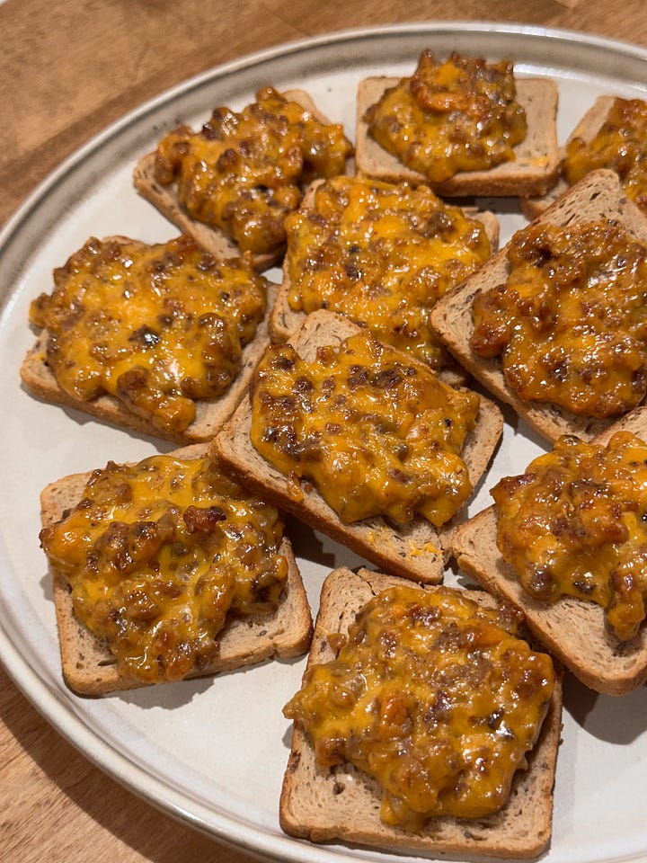 Lay the cocktail rye slices on a sheet tray and spread each one evenly with the sausage-cheese mixture.