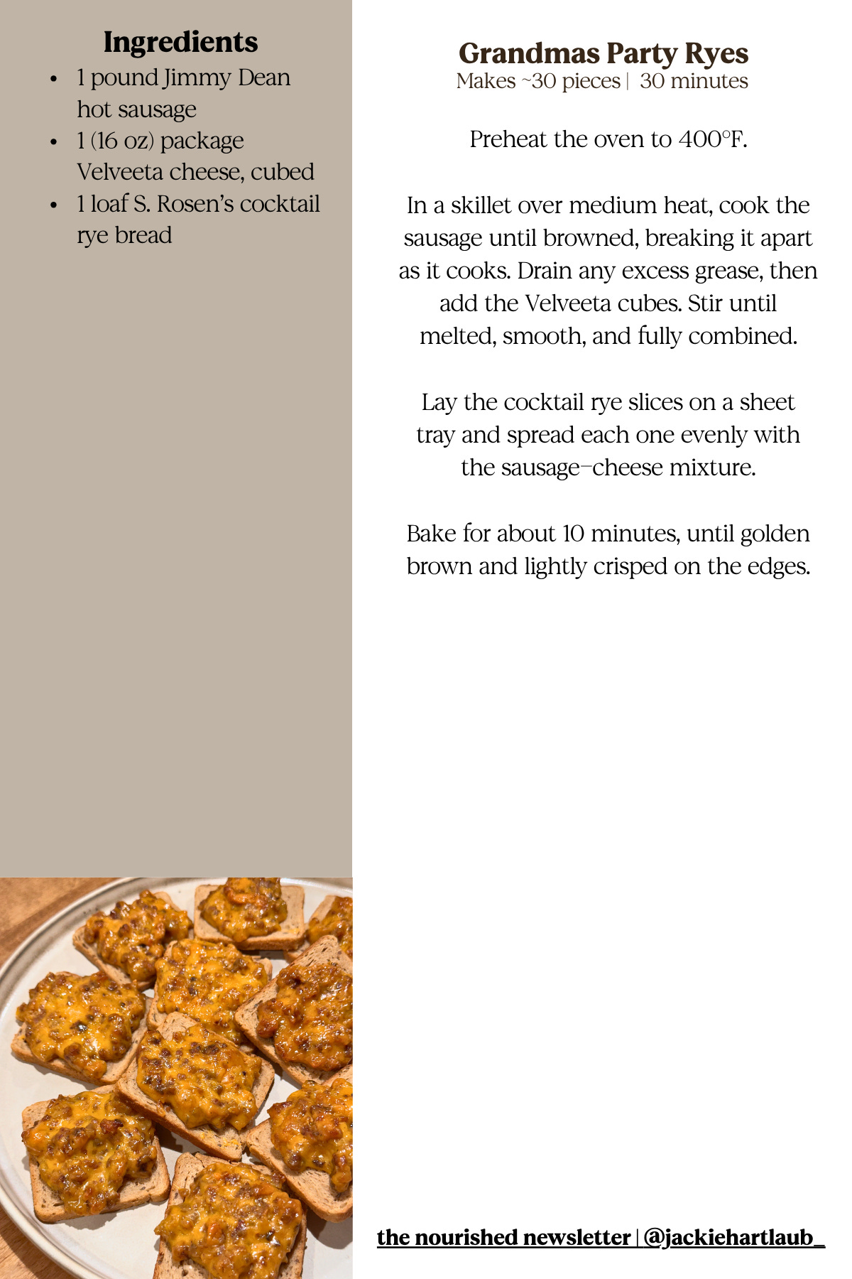 You can make the Party Ryes ahead of time, but they need to be fully assembled before baking because it’s easiest to spoon the sausage and cheese mixture onto the bread while it’s still hot and melted, so I don’t recommend prepping them separately. You can also cook the sausage ahead of time, then reheat it with the Velveeta when you’re ready to assemble and bake.