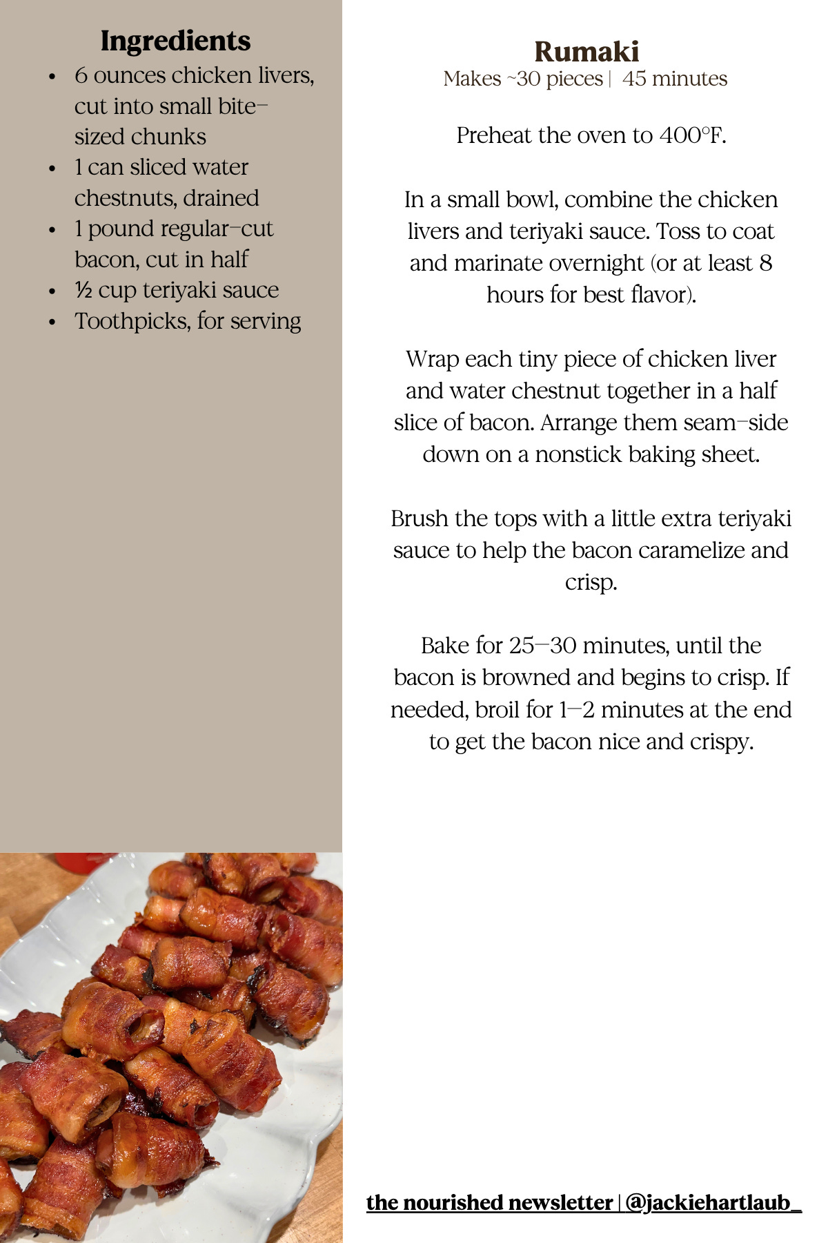 Marinate the chicken livers in teriyaki sauce the day before, then wrap them in bacon the next morning and refrigerate until you’re ready to serve. When it’s time, bake them straight from the fridge until the bacon is crispy and caramelized.